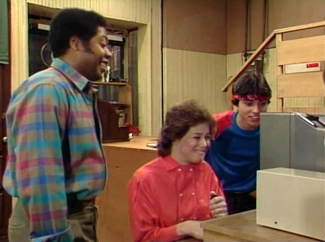 SCENE 2 | In the Fix-It Shop, David jeers Piri as he racks up a high score on a video game. Geri steps up to play, saying working with a joystick helps improve her coordination. She manages to nearly double Piri's high score and notes, "I also play to win!" |