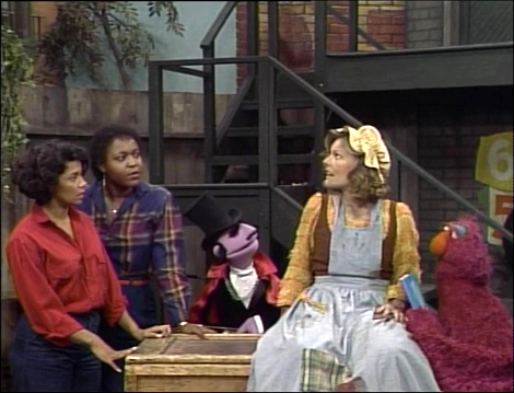 SCENE 1 | Telly shows Maria and Olivia how well he's gotten at reading by reading some of Cinderella. He becomes distraught when he realizes what a sad life Cinderella lives and wants to take her away from it. He consults the Amazing Mumford to see if he can use magic to bring her out of the storybook. Mumford has never tried such a feat before, but gives it a whirl. He waves his wand and suddenly Cinderella (Jane Curtin) appears before them! |