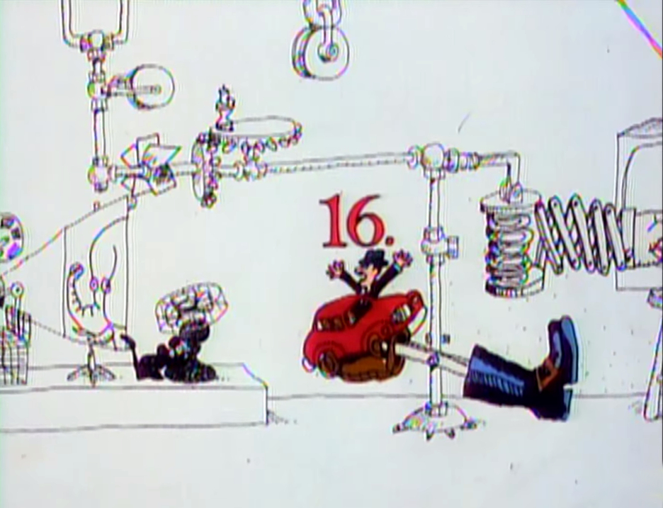 Cartoon | A Rube Goldberg device is used to turn on a television as the numbers one through twenty are featured. (First: Episode 1869) |