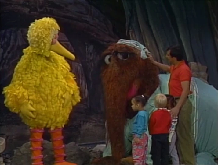 SCENE 1 | Big Bird tells Luis how happy he feels because Snuffy is coming over to play soon. However, Mommy Snuffleupagus arrives instead to inform Big Bird that Snuffy is stuck at home with the snuffle-flu. She's come to the street to retrieve various items for him such as books and toys, as well as Big Bird and friends so they can come visit as only Snuffleupaguses can catch the snuffle-flu. |