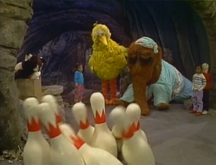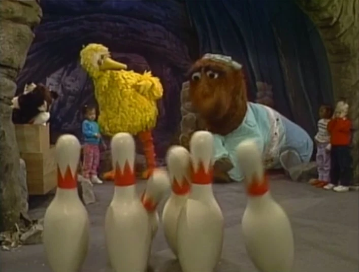 SCENE 5 | Snuffy takes another turn at snuffle-blowling, at first failing to make any pins fall down (a "gutter sneeze" is how Big Bird puts it). He tries again and knocks down every last pin, to which Big Bird cheers him on. Gordon announces the sponsors. |