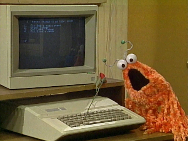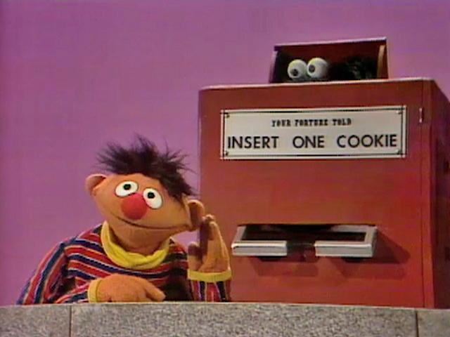Muppets | Cookie Monster and Ernie: Fortune Machine β Ernie tells the viewer to watch and listen for Cookie Monster so he won't take his cookie. (First: Episode 0756) |