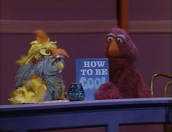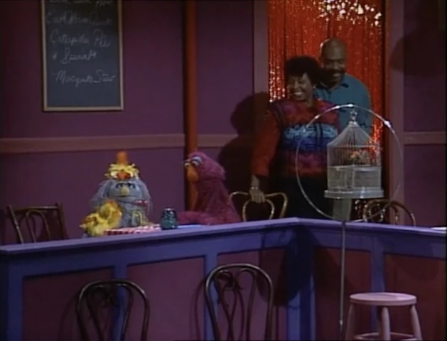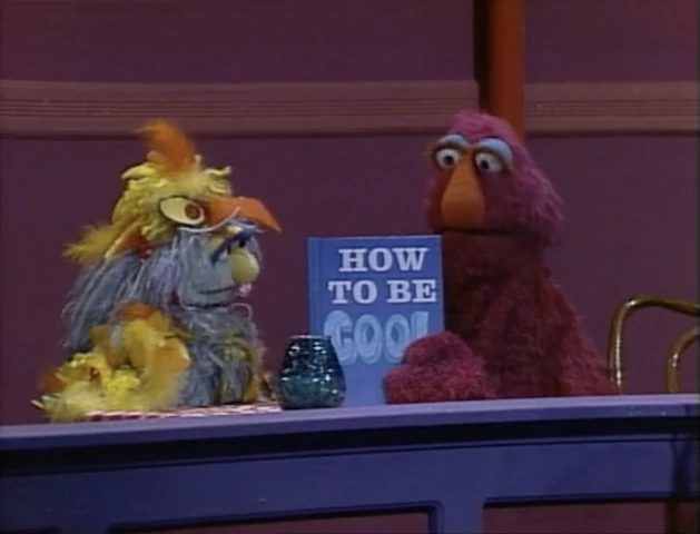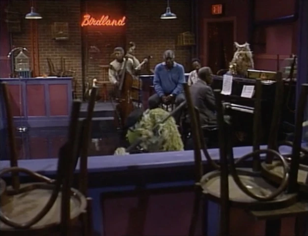 SCENE 1 | Gordon approaches Telly Monster, who is dressed in a ragged bird costume and making some bird calls. He explains that he's practicing to be a bird because he wants to go to the new club Hoots the Owl opened up called Birdland. Gordon tells him that the place is just called Birdland and you don't actually have to be a bird to go there, just "sit back, cool out, and let the music move you." Gordon invites Telly to go with him and Susan, but first Telly makes his way to the library to check out a book on how to "sit back, cool out, and let the music move you." |