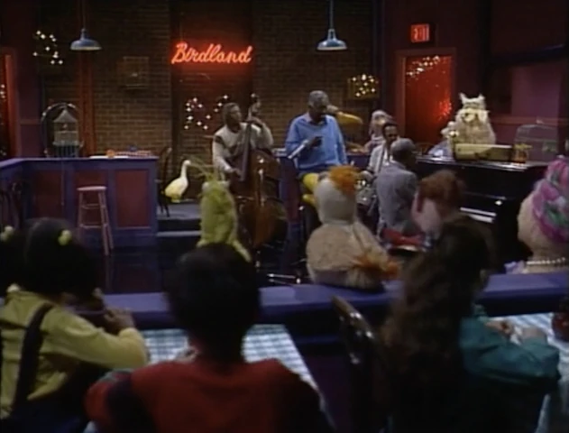 SCENE 2 | The Robinsons and Telly arrive at Birdland while the band is playing and Telly finds an open chair at a table with another monster. She tells him it's okay if he wants to sit there, so Susan tells him she'll be at another table nearby. Gordon asks who Telly's companion is, but he doesn't know her name. She introduces herself as Juliet, sharing a gaze with Telly. After a pause, she begins to explain why she's wearing a bird suit, but Telly guesses it was for the same reasons he was worried about coming to Birdland. He explains what Gordon had told him earlier, and offers advice on how to "sit back, cool out, and let the music move you." They read the book together which leads to their swaying to the rhythm of the music. At the end of the number, everyone begins applauding. Telly and Juliet are slightly embarrassed by the attention, but say they couldn't have done it without the book. |