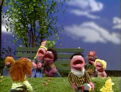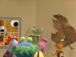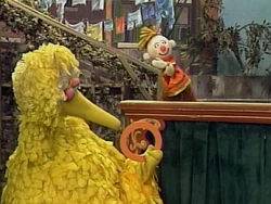 SCENE 4 | An exasperated Big Bird tries to get Snuffy and Gus to calm down and work together so they can get on with the show. Big Bird now presents a circle, which neither Gus nor Snuffy can identify (as it's out of Snuffy's view). Snuffy and his puppet apologize to each other, further irritating Big Bird. |