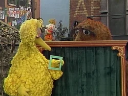 SCENE 3 | Big Bird introduces the Snuffle Puppet Show starring Snuffy's puppet Gus. Today's show is all about shapes and Big Bird presents a square to Gus. Snuffy gets so into character that when Gus drops it, the two get into an argument and accidentally mangle the shape up. |