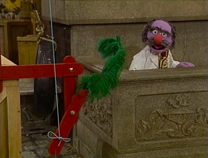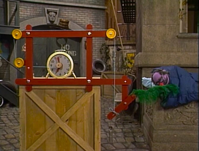 SCENE 1 | Dr. Nobel Price sleeps along the basement rail of 123 Sesame Street, allowing him to test a large machine he just invented: a "wake-up" machine. He shows Gordon how it works: a spool of thread is attached to the hands of a clock so that when the hands move, it lowers the string which is wired on a pulley, which will lower a lever and lift a feather to Dr. Price's nose, thus tickling him and waking him up. Gordon points out to the viewer that there's already such a simple invention - an alarm clock - when an actual alarm on the contraption rings. Dr. Price explains that the sound reminds him it's time to do his morning exercises. |
