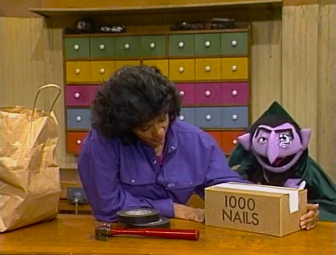SCENE 2 | The Count counts everything Maria takes out of her shopping bag of supplies for the Fix-It Shop, including rolls of tape, a hammer, and a box that says "1000 NAILS." The Count insists on counting every single nail, despite Maria showing him that the writing on the box already tells her how many she has. She relents on the condition that he does his counting outside the shop. |