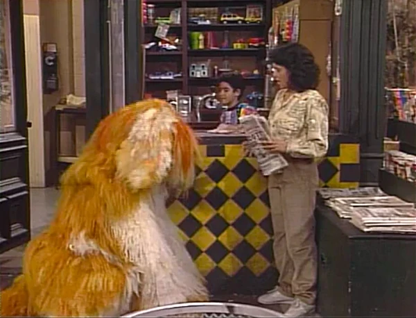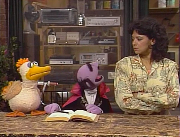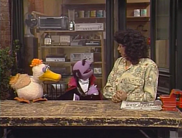 SCENE 1 | Maria stops by Hooper's Store to get a newspaper from teenage helper Jason (Alexis Cruz), running into Barkley along the way. At the Fix-it Shop, the Amazing Mumford reveals he will attempt a trick he's never tried before: he will make Barkley quack like a duck, and make a Muppet duck bark like a dog. After waving his wand and saying the magic words - "A la peanut butter sandwiches on quackers" - there's no change in Barkley's voice. However, Mumford accidentally makes Maria quack like crazy and the duck speak in Maria's voice! Mumford rushes to the library to come up with a remedy while the Maria-voiced duck leaves for a swim, leaving Maria deserted in her predicament. |