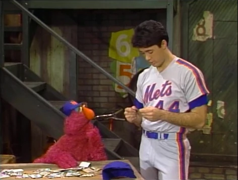 Muppets / Celebrity | Baseball fan Telly is looking at his cards when he sees a familiar face stop by. He asks the man to pose for him, to compare him to the card on which he thinks he's seen him. He realizes that it is indeed Ron Darling of the New York Mets, and he asks him to read his own card. (First: Episode 2080) |