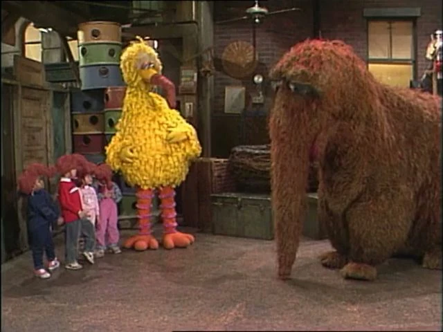 SCENE 2 | Snuffy kicks off the very first meeting of the Snuffketeers. He tells the members (Big Bird and the kids, wearing snuffles strapped to their heads) about things Snuffleupaguses do such as move their four legs and smoosh through doorways. Big Bird points out that none of them are built like actual Snuffleupaguses, thus they can't do such actions. They then hit upon something they can do - sigh "Oh dear" (which becomes part of the official club motto). |