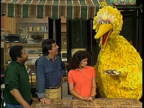 SCENE 6 | Luis tells Maria and David about what just happened, when Big Bird returns with a plate of brownies. The grown-ups all pass on them, so Big Bird offers them to the kids instead. It turns out that he didn't have any more birdseed brownies, and the ones he just gave away were normal brownies that Gordon made. Biff announces the sponsors. |