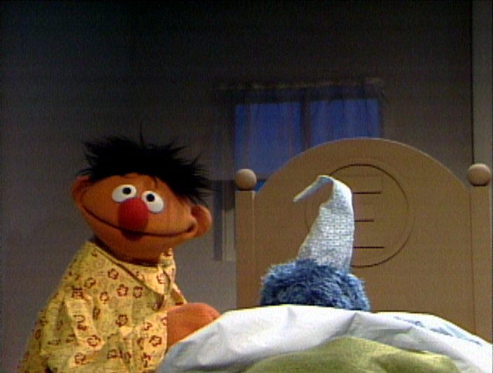 Muppets | Cookie Monster and Ernie: Cookie Monster Sleeps Over Part 1 β Cookie Monster is frightened of a shadow on the wall, but Ernie shows him it's just a blanket on a toy chest. (First: Episode 2027) |