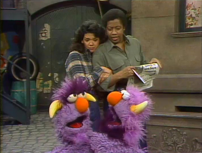 Insert | Maria and David observe the Two-Headed Monster and imagine what it would be like to be a two-headed being as well. They picture themselves in a large sweater (appearing as though they have two heads) and soon find they can't make up their mind whether to sweep or take a nap. Back in reality, they go through a similar argument in deciding where to go for a date. (First: Episode 1705) |