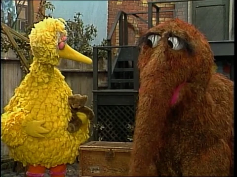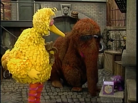 SCENE 2 | Snuffy tells Big Bird that he loaned his (Big Bird's) storybook to a friend, and gives him clues as to who it could be: they're furry, has four feet, and the traits of a Snuffleupagus. Of course it turns out to be Snuffy, but he's also loaned the book to another friend - Mr. Anteloper. Big Bird situates Radar next to Mr. Anteloper so they can read together. |