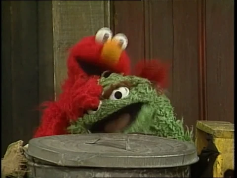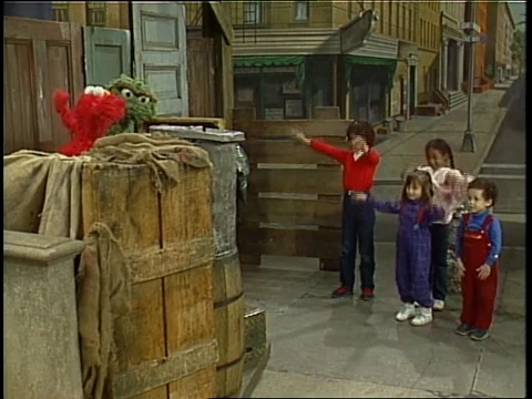 SCENE 4 | By Oscar's trash can, Elmo leads an exercise class with the kids, to Oscar's annoyance. Elmo instructs everyone to hold their arms either up and down or in and out, then orders everyone to hug their neighbor - and since Oscar is so close, he hugs the poor Grouch. Oscar desperately tries to get Elmo dislodged from him as Susan announces the sponsors. |