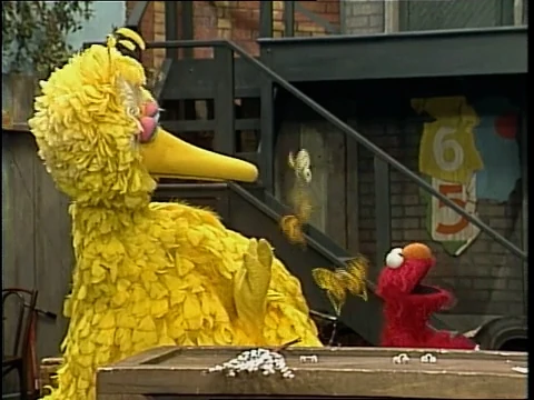 SCENE 3 | Elmo and Big Bird are selling earmuffs made from pussywillow buds. Big Bird doesn't think the business will succeed, as they are much too small for normal customers like Susan and Mathew. Elmo does manage to make a sale to Mrs. Butterfly and her friends. |