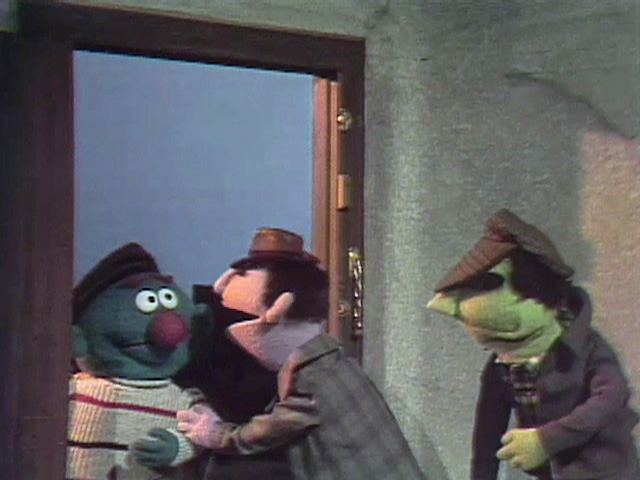 Muppets | Benny and his boss have been waiting for Lefty for a long time. Benny wonders how they will know when it's Lefty at the door, so he reminds him that Lefty will knock three times - their secret knock to enter their hideout. Lefty forgets the number, and has to be hinted from his boss what the number of knocks are to gain access, finally giving the correct amount. When they let him in, the boss reprimands him for his poor memory, and warns him that he'll be in big trouble if he forgets again. To test his memory, the boss and Benny lock themselves out, telling him not to let them in until they give the secret knock. Despite the boss' warning, Lefty forgets once again, and finally having enough, he fearfully runs out the back door, leaving the other two stranded outside yelling, "Let us in!" as they angrily pound on the door trying to get in. (First: Episode 0722) |