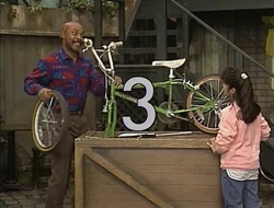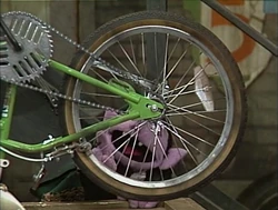 SCENE 4 | The Count observes Gordon as he adjusts Jennifer's bicycle, ensuring that every part is working perfectly. The Count counts all of the bike safety rules Gordon lists off, and moves on to counting the spokes on the rear wheel. Gordon checks on the chain drive that spins the wheel, and the Count learns of another important safety rule: never count the spokes while the wheel spins - otherwise, you'll get dizzy! |