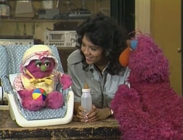 SCENE 3 | Maria is looking after Baby Natasha, but needs to make a call to Ms. Singer. She asks Telly Monster to watch the baby, but he doesn't think he can since he doesn't understand baby talk. As Natasha babbles, he's able figure out that she wants to feel his hair, then his nose. He repeats the different sounds she makes for each, thinking he's cracked a baby talk code. When Maria returns, he feels he has to hang around longer in order to help others understand her too. |