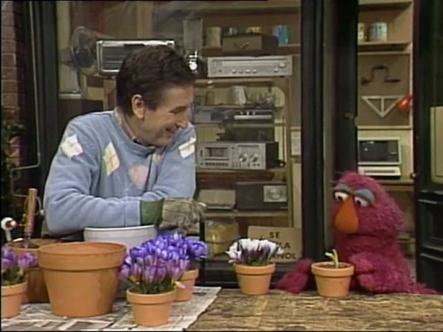 SCENE 1 | Bob tends to some of his crocus plants, noting that spring is in the air at last. Telly comes by with a problem - he planted his own crocus bulb in the winter, but he's discovered a nasty green thing is starting to take up space in the flower pot. Bob points out the bulb is his crocus plant, just starting to bloom for the spring. Telly apologizes to the bulb for yelling and starts to fret that he doesn't know how to take care of a baby plant, thinking it's much like human baby care. Bob tells him to give it plenty of sunshine, occasional water, and sometimes talk to it. Telly goes off to read his plant the story of "Jack and the Beanstalk," and when no one is looking, Bob decides to start telling one of his plants a joke. |
