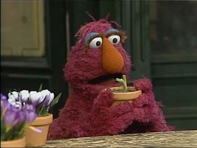 SCENE 2 | Telly sits and waits for his crocus to grow into a flower, thinking the plant might not know what to do and should go to "crocus school." Big Bird has the kids pretend to be plants and grow to help inspire his plant, but Telly is disappointed when this doesn't seem to work. Mesha lets Telly know that plants take a while to grow, so he just needs to wait. The others go to Hooper's Store for some lemonade, leaving Telly to quietly encourage his plant to grow. |
