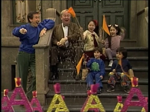 SCENE 1 | Bob notices Uncle Wally and the kids waiting on the stoop, holding pennants with the letter A on them. Wally says they're waiting for a parade, and a parade consisting of sparkly letter As passes by. |