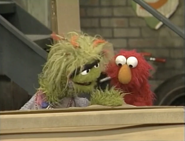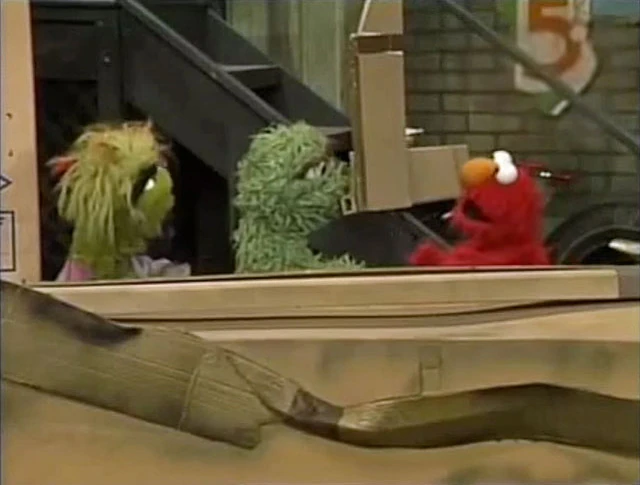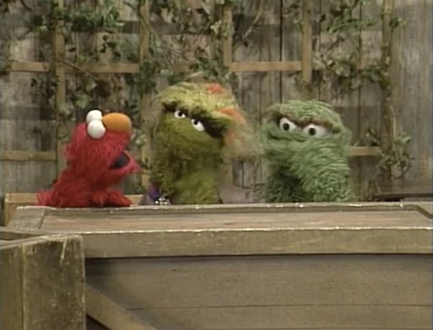 SCENE 4 | Elmo notices Oscar and Grundgetta aren't feeling peppy because his nice presence has ruined their pretend flight. Elmo makes things better by pretending he's a Grouch and starts arguing with the two, which cheers them up. The three continue squabbling as Telly announces the sponsors, and the credits roll. |