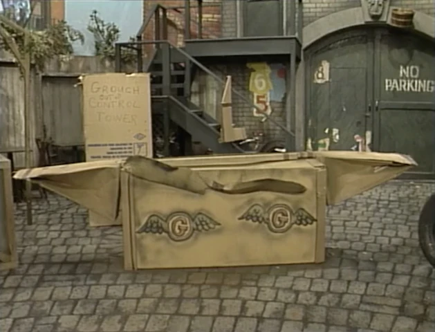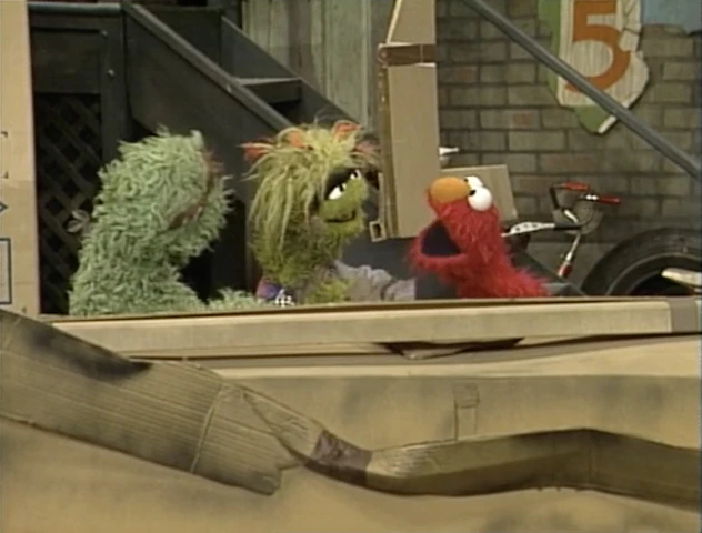 SCENE 1 | Oscar and Grundgetta are about to pretend they're flying on Grouch Airlines in the yard, using crates and cardboard as their airplane and "out of control tower." Elmo wants to play with them, and the Grouches struggle to come up with a good excuse for not letting him. Elmo conjures up his imaginary luggage, plane ticket, and every other supply he would need on the plane when Oscar says the flight is only for Grouches; Elmo just decides to make-believe he didn't hear that and boards the plane. |