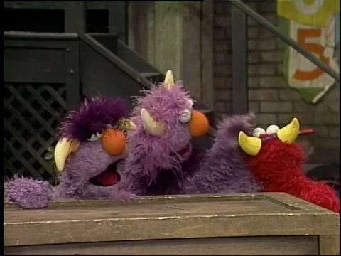 SCENE 1 | Elmo likes watching the Two-Headed Monster and wishes he could join him in the fun. With Susan's encouragement he approaches the monster and asks if they're willing to be a three-headed monster. Susan interprets as the Two-Headed Monster requests Elmo talk like them and don a set of horns. Elmo does this, and they all laugh and speak their monster language. |