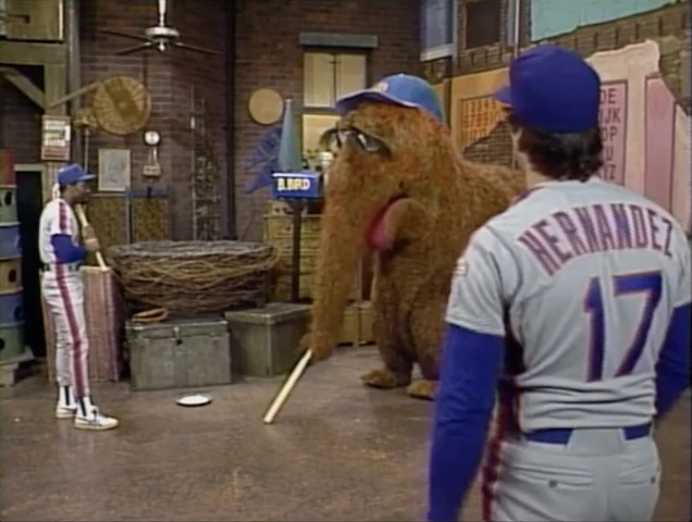 - In the original script draft, the scene with the New York Mets was slightly different. Big Bird was present during the scene (rather than in just voiceover), with the context that he wrote to the team to visit and help Snuffy practice for the Snuffleupagus Little League team. The script also called for catcher Gary Carter to be part of the group. The scene was also intended to be part of the street story, as the episode would close with an additional scene where the Mets try to get Snuffy to sign a season contract, but Snuffy feels he's not ready; he only knows how to write in print, not cursive.[1]