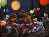 It's a special night in Woodland Valley --- tonight is the night of Harvest Moon. There's a special party out at the Otter Pond and Luna even has a special surprise for Bear. Bear and his friends enjoy the delights of the night, such as fireflies and constellations. Tutter does his best to stay up, but Bear allows him to catch a little sleep before the big celebration. Bear searches for party lanterns for the celebration, but it's ultimately Pip and Pop who find them. Everything is finally ready for the big party and it's drawn quite a crowd --- besides Bear and the kids, Doc Hogg, Lois, Otto and Etta, Grandma Flutter, Christine, Jacques the Beaver, Doc Owl, and even Big Old Bullfrog are there. In fact, everyone's there except Luna --- they're worried she may have disappeared behind a cloud. But it turns out she was just getting her special surprise ready --- an old friend Bear hasn't seen in a long time! In the Shadow segment, Shadow tells a wild story about a man who takes a trip to the moon in a balloon. She also helps Bear wake up Tutter in time for the party.