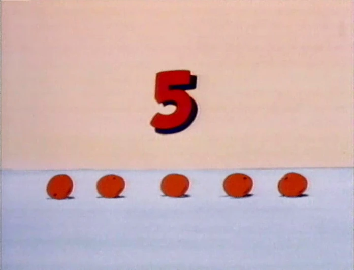 Cartoon | Maria (in voice-over) counts five oranges, which are then eaten by a snake. |