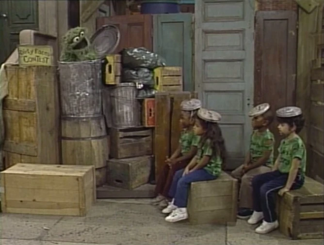 SCENE 2 | Oscar kicks off the annual Grouchketeer Dirty Face Contest. Some of the other Grouchketeers are the judges and note what parts of the face are the messiest on the contestants. The winner's face is so dirty, Oscar can't tell who it is (nor will they tell who they are) - a true Grouch double winner! |