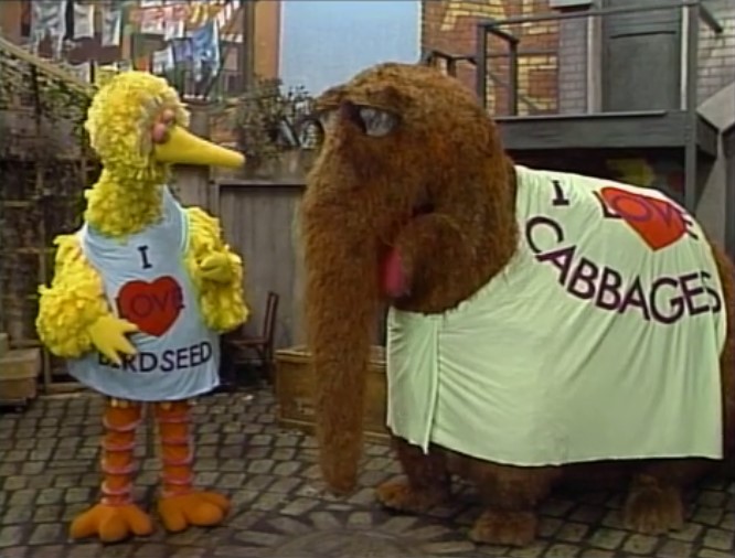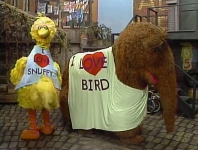 SCENE 3 | Big Bird waits for Snuffy while wearing his new "I Love Birdseed" t-shirt; he giggles over a surprise he has for his friend. Snuffy finally arrives, wearing his own "I Love Cabbages" shirt. They both reveal the backs of their shirts say "I Love Bird" and "I Love Snuffy." |