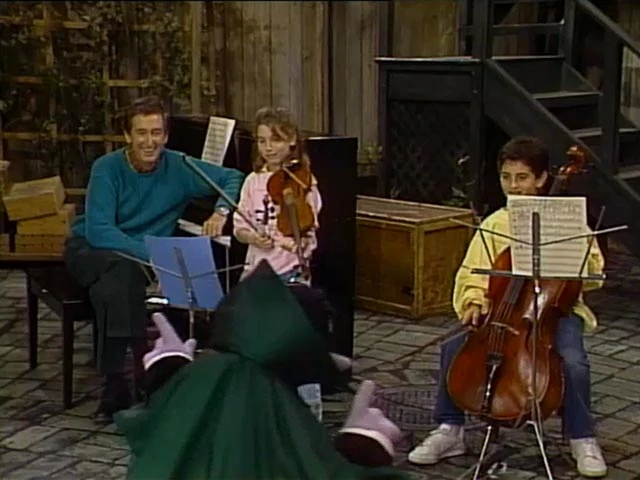 SCENE 5 | Bob asks the Count if he wants to play some more music, but he's still busy keeping a steady beat, scatting "one, two, three, four" at a faster tempo. Bob and the kids follow the Count's beat and play the Sesame Street theme. Snuffy announces the sponsors. |
