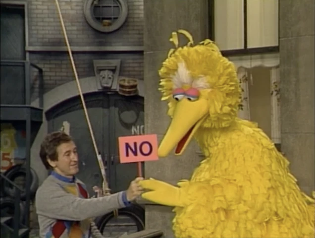 SCENE 1 | Bob creates a new game where he asks Big Bird questions that all have "No" as an answer; Big Bird responds by saying "No," while holding a sign with the word. After the game, Big Bird continues to say "no" to everything Bob asks. |
