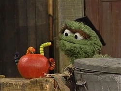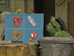 SCENE 3 | Oscar's School for Worms is in session! He teaches Slimey and his worm friends about sorting trash by singing "Three of These Things," using pictures of a flowerpot, a can, a box, and an apple. The worms point out the apple doesn't belong and wish to have it. Oscar hands the apple picture to them and they somehow devour it, leaving only a cardboard apple core. |