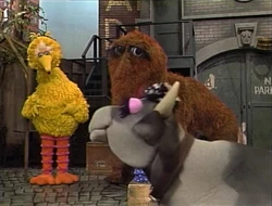 SCENE 2 | Big Bird introduces a small audience of kids to Snuffy, who will perform an original act. Snuffy plans to walk from here to there backwards, but a nearby cow does it first. He changes it to hopping, but is beaten again by a rabbit. Snuffy settles on doing both walking and hopping backwards, earning much applause. |
