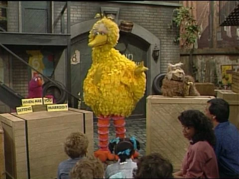 SCENE 2 | Big Bird paces the Fix-It Shop, wondering why Maria and Luis (petting Gatita) don't know when they'll be getting married. They explain they'll think about marriage when they feel the time is right; Big Bird then asks when that will be. |