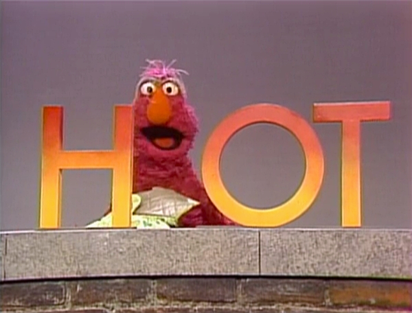 Muppets | Wearing oven mitts, Telly places an H and an OT together to make the word HOT. (First: Episode 1536) |