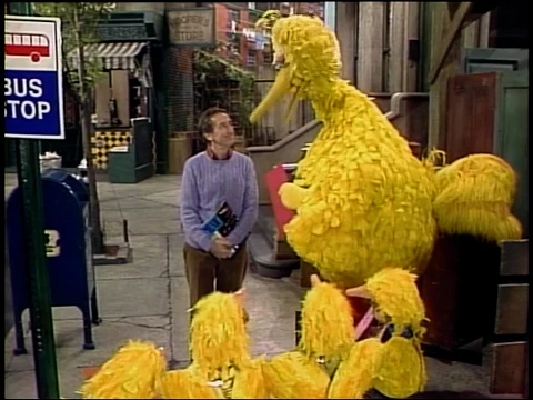 SCENE 3 | Big Bird and the Birdketeers meet Bob at the bus stop and try to give him the latest issue of "Birdketeer Magazine," a publication made by and about the club. Bob is interested and asks for an issue to read on the bus, but there's two catches: he receives them as separate sheets and the Birdkeeters come with them. |