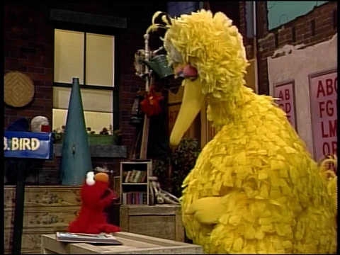 SCENE 1 | Elmo learns what a dinosaur is from Big Bird and one of his books. Big Bird suggests they pretend to be dinosaurs, and Elmo begins to stomp around and make meowing noises until Big Bird points out dinosaurs don't sound like that. They don't sound like pigs either... but what do dinosaurs sound like? Since nobody knows, they decide to make noises based on Elmo's favorite words: "Happy birthday!" |