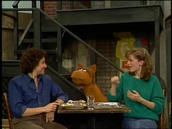 Muppets / Celebrity | Danny DeVito arrives at a bus stop, where Oscar and Bruno are also waiting. Oscar explains that it's a Grouch bus stop, which means the bus doesn't stop for them. (First: Episode 2145) |