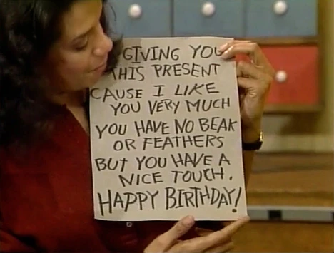 SCENE 2 | Maria supplies Big Bird with a larger piece of paper and he copies his poem, adding "Happy Birthday!" on the bottom. As soon as Big Bird leaves again, he realizes his name's not on it, so Luis won't know it's from him. Maria is forced to undo her beautiful wrapping job once more... |