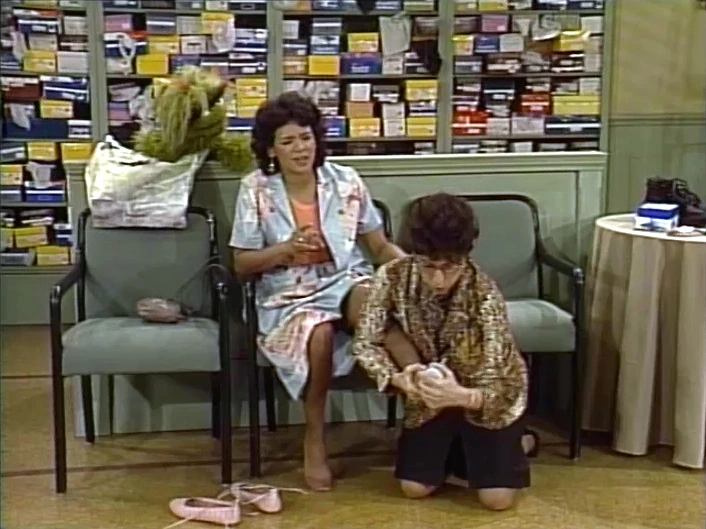 Celebrity | Edith has gone through all the shoes she has in Maria's size, with only four pairs remaining: three pairs of boots and a pair of pumps. After playing "Three of These Things," Maria chooses the pumps. Edith thinks she tackle any customer now, until Mrs. Snuffleupagus enters with a large request. Part 2 (First: Episode 2203) |
