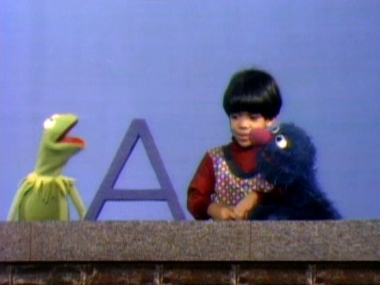 Muppets | Muppet & Kid Moment — Kermit asks Grover and Debo to identify his letter A. Grover has no idea. When Dabo says "A," Kermit says "Ay" to someone offscreen. (First: Episode 0629) |