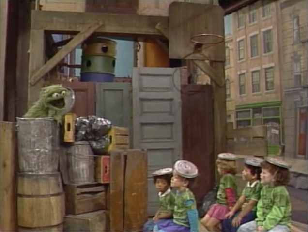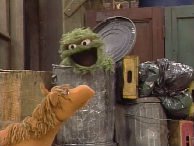 Insert | Oscar holds a Grouchketeers meeting, teaching them some Grouchy words, such as "rotten," "yucky," and "terrible." Buster the Horse appears and teaches him another word - "abominable," which he passes onto the kids. Maria is pleased he's learned a new word and gives him a kiss of congratulations, making him furious. (First: Episode 1969) |