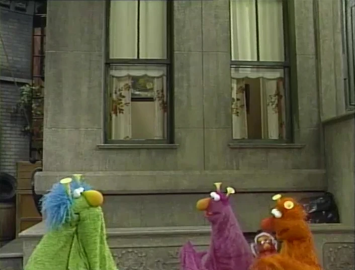After the musical sequence ends, Big Bird shows up and asks what they're holding. They tell him it's what they'll be wearing tomorrow, and he asks, "What's tomorrow?" Luckily he's only joking, and celebrates the big day with them. |