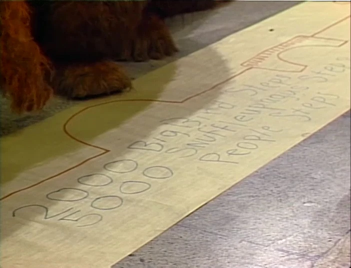SCENE 4 cont'd | The two finally get back to Sesame Street. Big Bird has counted 2,000 steps once more, while Snuffy has counted 5,000. They argue over who's right and Bob points out that they both take different-sized steps, thus causing the difference. Big Bird doesn't know what number to put on his map, so Bob suggests both - in Big Bird steps and in Snuffleupagus steps. Big Bird then makes Bob walk to Snuffy's cave and count his steps so he can measure the distance in people steps. |